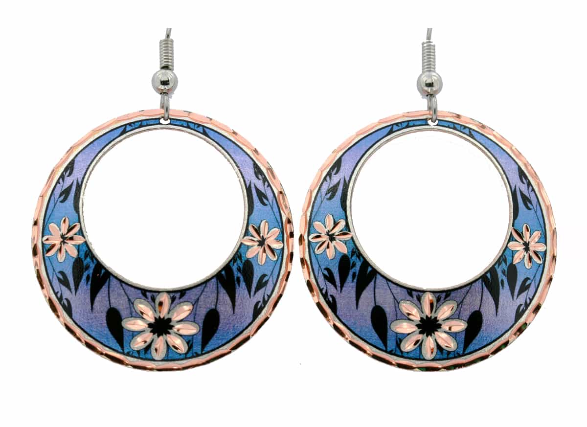 Purple blue circle flower earrings artisan-crafted from hoop shape copper with lovely flowers & purplish blue background. Shop flower earrings that sparkle on your ears and brighten your days. Copper flower hoop earrings will be a special addition to your jewelry collections.