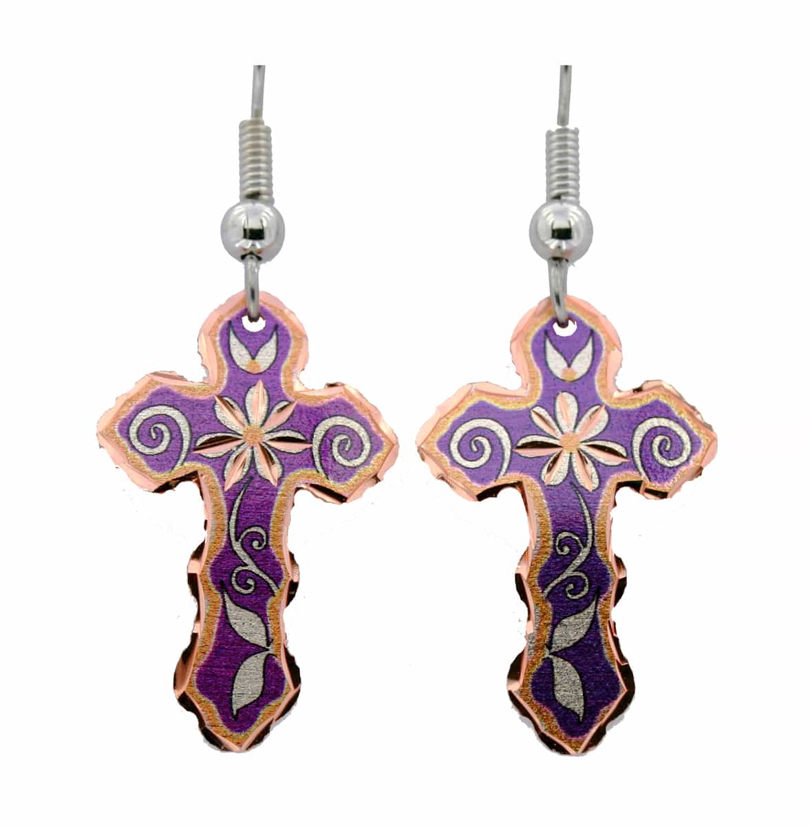 These timeless treasure purple color copper flower cross earrings will impress your friends every time you wear them. Purchase these wholesale flower cross earrings for your gift shop now! Your customers will be attracted by the quality of workmanship at a very reasonable price. Earrings are lightweight, ear wires are the best quality surgical steel hypoallergenic so you can comfortably and safely wear them for a long time even if you have sensitive skin.