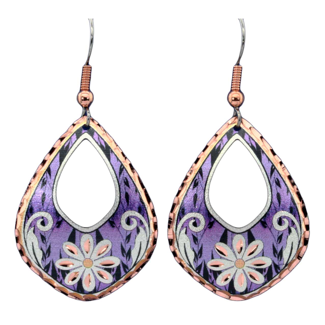 Purple flower earrings are made from diamond shape copper with a punched-out part for a stylish look. You will love the translucent purple background color with black leaf accents. These gorgeous earrings have easy-to-put on the best quality surgical steel French hook ear wires with rose gold plated ball and spring.