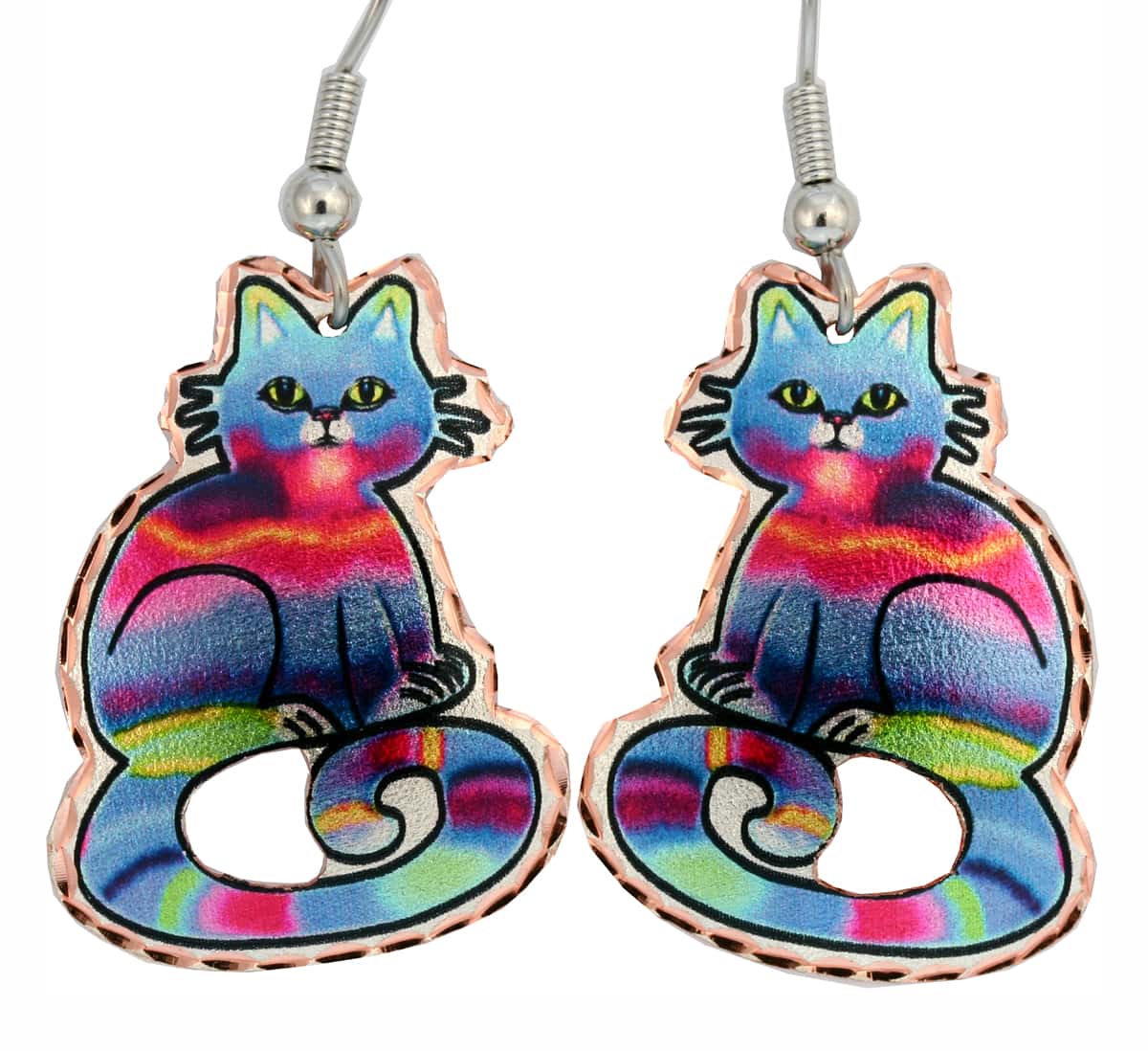 Indulge in the fusion of elegance, artistry, spirituality, and individuality with these exquisite cut out rainbow whimsical cat earrings. Handcrafted from silver-plated copper, each piece is meticulously diamond cut by hand to sparkle and shine with every movement. The intricate craftsmanship and delicate details make these earrings a wonderful addition to your jewelry collection. Lightweight and fitted with surgical steel hypoallergenic ear wires, they provide comfort and durability. With their vibrant colors and mesmerizing design, these unique artisan earrings are sure to impress everyone and accentuate your fashion style. Shop now and experience the magnificence of these sparkling beauties.