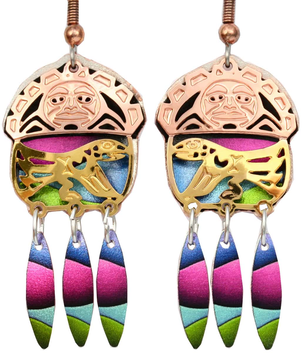 Northwest Native jewelry raven and sun totem earrings are handcrafted in two tone gold and copper plated cut through design with colorful copper background and dangles. The Raven captured the sun and placed it in the sky so the world would have light, he put the trees on the land, fish in the water and opened the clam shell to release man.