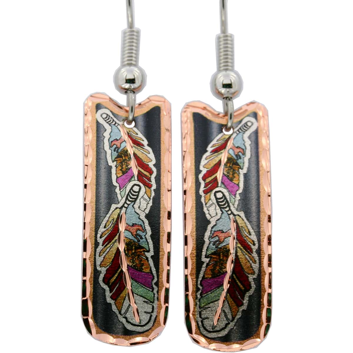 Copper feather art earrings are created in colorful feather artwork in dainty rectangular-shaped. These awesome earrings have easy to put on the best quality surgical steel French hook ear wires with rose gold plated ball and spring. These dainty rectangular earrings are 9.5 mm X 27.5 mm ( about 0.38 x 1 inches ) in size. Incredibly unique handmade jewelry that you will always treasure for many many years.