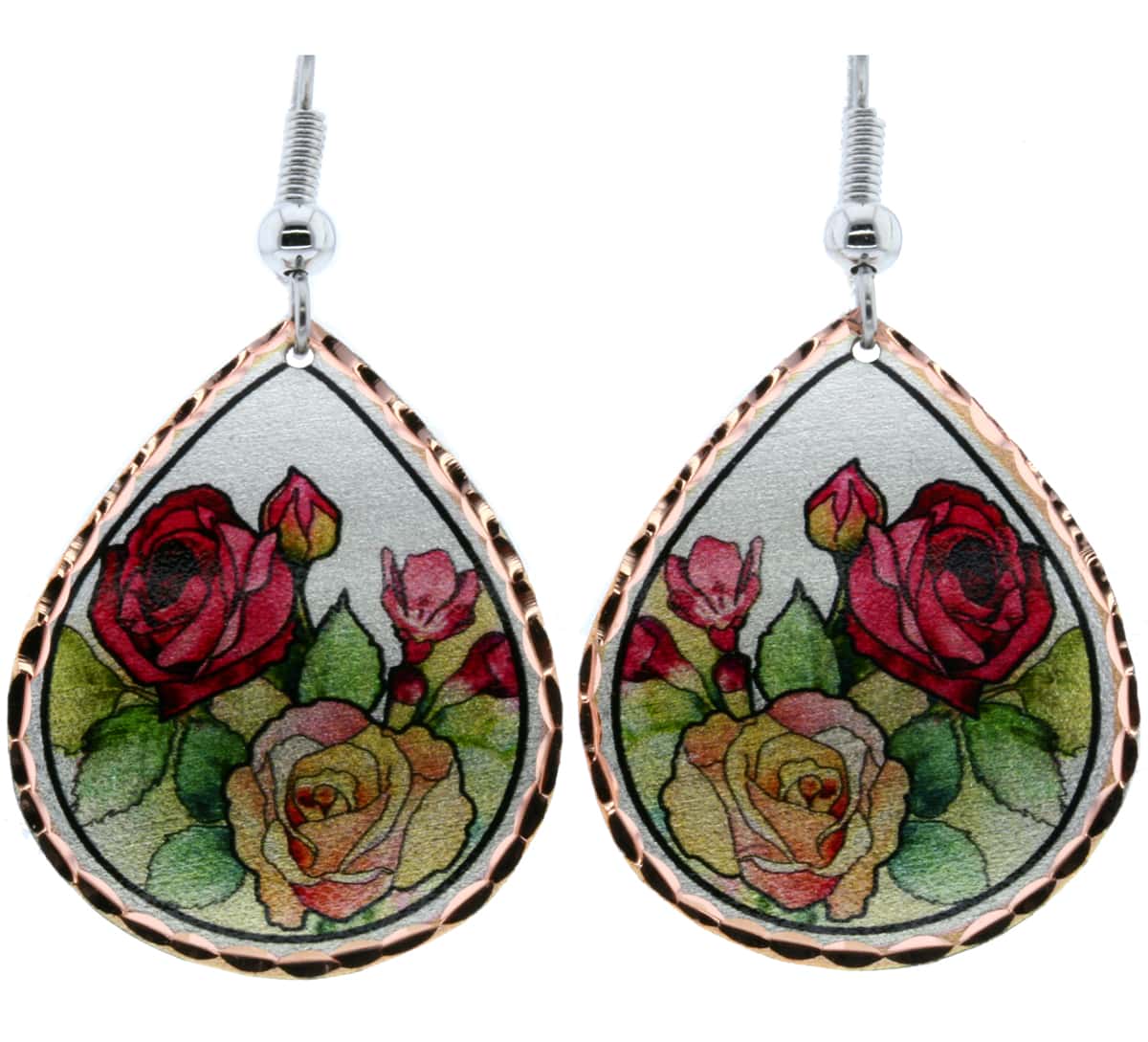 Red and yellow roses teardrop earrings feminine and delicate made from copper in red and yellow roses design with a silver background. If you are looking for original and stylish jewelry that is one of a kind and does not need any maintenance, these rose earrings are the perfect choice for you!