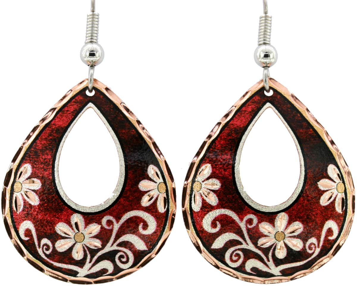 Red daisy earrings are handcrafted from copper in flowers with pretty shades of dark red. Buy daisy earrings for a special gift for your wife or girlfriend. These stylish and fascinating teardrop shape copper earrings with a pierced hole on top are 23 mm X 27.5 mm ( about 0.65 x 1.45 inches ) in size. These gorgeous earrings will make a wonderful anniversary gift, your wife will love them.