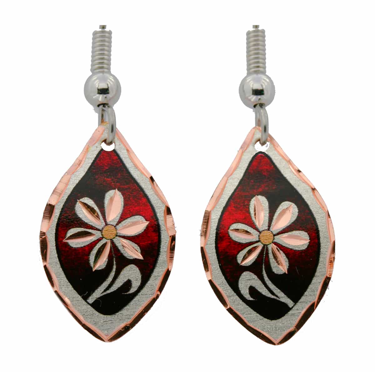 Red teardrop flower earrings handcrafted from copper with a beautiful flower design and ruby red background. Buy feminine & fashionable dainty flower earrings. Aren’t these delicate copper flower earrings just the perfect handmade jewelry that you would love to have or to give to that special best friend?