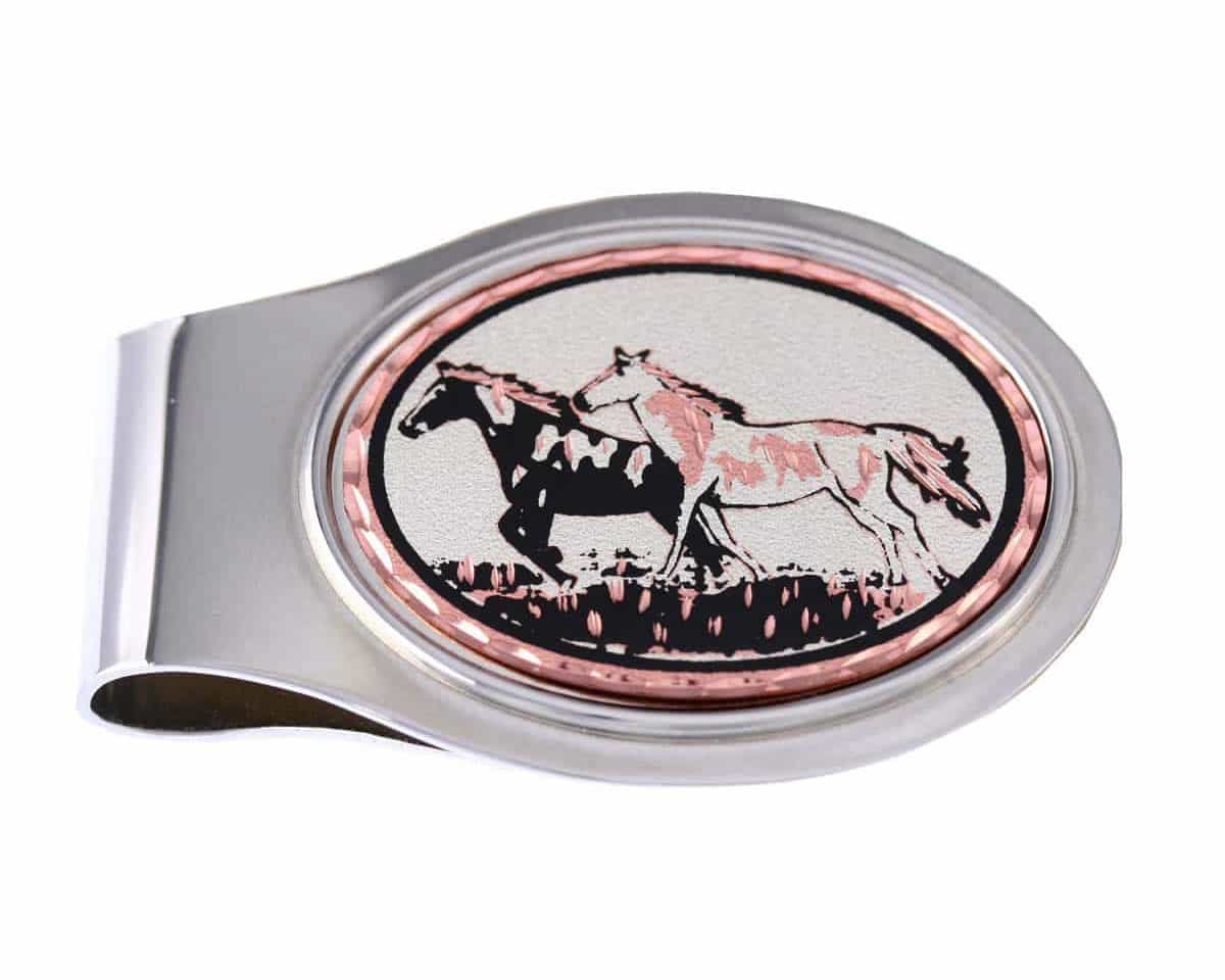 Running horses money clips with silver plated and diamond cut copper artwork inlays would be great addition to western gift stores, tack shops and trading posts in Canada and the United States. The Horse has long been honored as helper, messenger, and harbinger of spirit knowledge to Native Americans.
