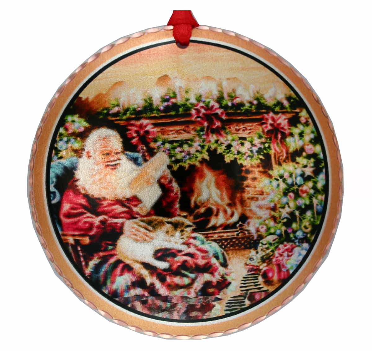 Handmade copper Christmas tree ornaments are silver plated and diamond cut to make them sparkle. This colorful Santa reading letters from children beside the fireplace has an old fashioned charm.