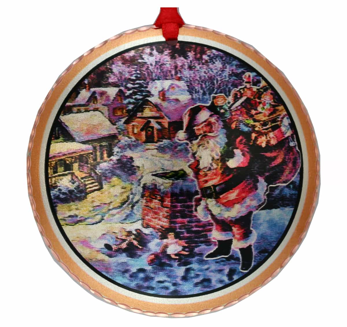 Handmade Christmas tree ornaments are silver plated and diamond cut to make them catch the light and add sparkle to every tree. This colorful Santa on the roof is getting ready to go down the chimney with his sack of toys for the children.