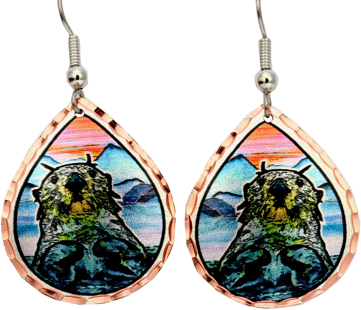 Alaska sea otter earrings are handcrafted from copper in pretty sea otter designs with vibrant colors. Shop adorable sea otter earrings unique and stylish. These delicate triangle shape copper earrings are 22.5 mm X 23.7 mm ( about 0.89 x 0.93 inches ) in size. Earrings are made from high-quality materials, including copper and nickel-free hypoallergenic surgical steel ear wires. No need to worry about the finish of our handmade jewelry, as they are coated with layers of acrylic. The Sea Otter lives in ocean waters along the Northwest Coast, and its thick warm pelt formed the basis of the early fur trade along the coast.