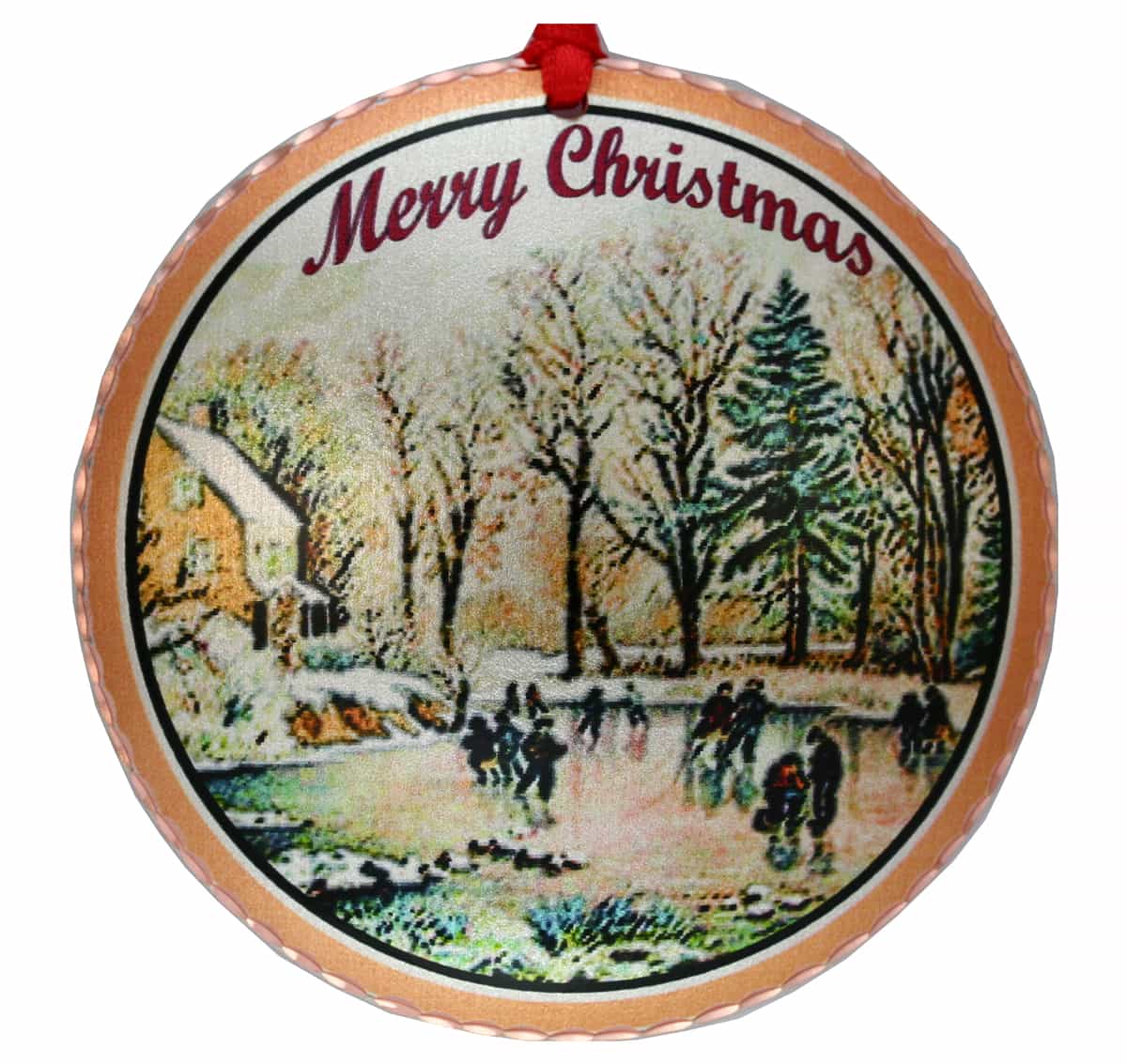 Handcrafted Christmas ornaments are silver plated and diamond cut on copper in this charming Skating on Pond design.