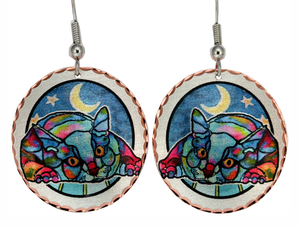 Original sleeping cat earrings with moon and starts night background created by Jo Lynch.