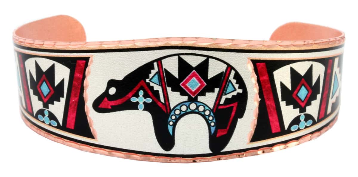 SW Native copper bear bracelet is handcrafted in the finest quality in an amazing Southwestern design with diamond cuts to sparkle. Buy this lovely Native bear bracelet that is one of a kind and does not need any maintenance these exceptional earrings are the best choice. Are you looking for handmade jewelry? Copper Reflections offers the most unique handmade jewelry that makes a statement. Show your love for Native American cultures by wearing quality and stylish handmade jewelry created by highly skilled artisans since 1985. The Bear symbolizes the most powerful of animals who are believed to have the power to heal and transform passions into true wisdom.