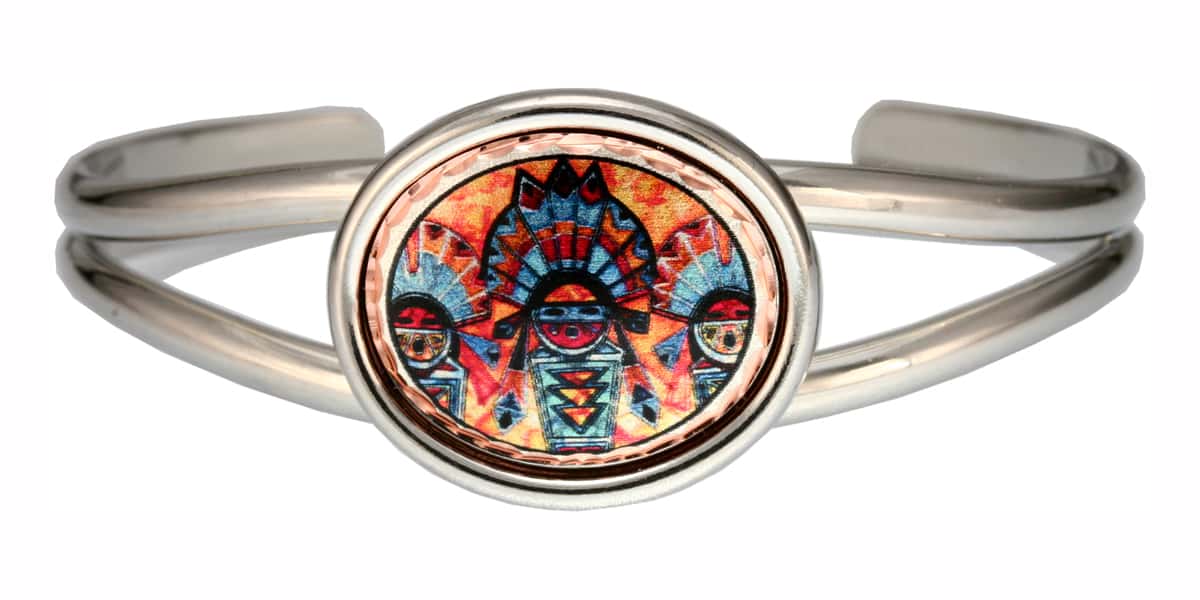 Bold and vivid, this colorful Southwest Native Kachina artwork by Lynn Bean is transformed into the most unique bracelet by the skilled artisans of Copper Reflections.
