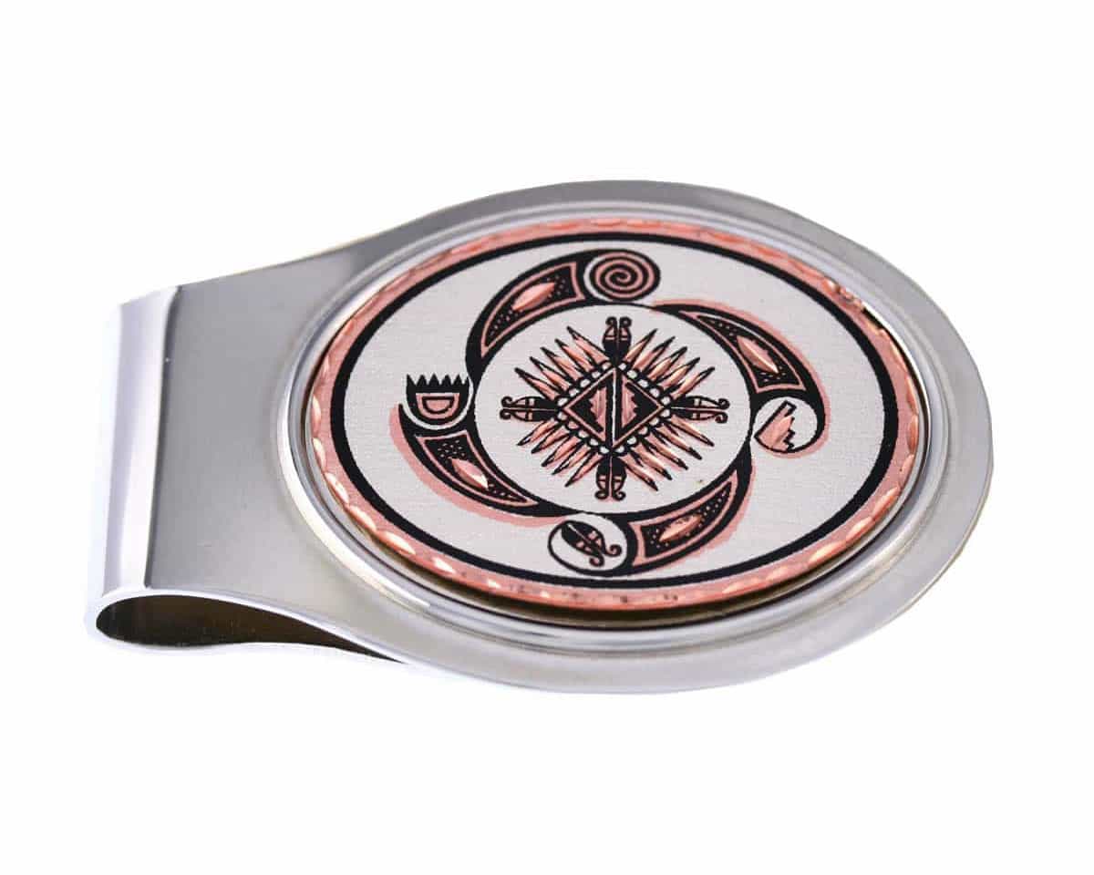 Southwest Native American theme money clips are handcrafted, silver plated and diamond cut on copper in this four elements design representing earth, wind fire and water. These Native money clips will make a great addition for Native trading posts and gift shops in Canada and the United States.