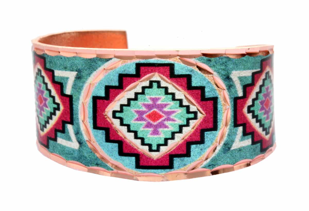 Beautiful colors highlight this Southwest Native inspired design on these copper handmade rings. Native American symbols were geometric portrayals of celestial bodies, natural phenomena and animal designs. Native symbols can vary in meaning from one tribe to another and across different regions.