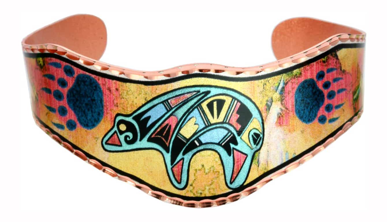 Bold and vibrant colors of this Southwest Native bear design by Lynn Bean make these handmade bracelets extraordinary. Copper bracelets are handcrafted, silver plated and diamond cut.The Bear symbolizes great strength, power and healing. The Bear paw represents self-knowledge and is a spiritual guide.