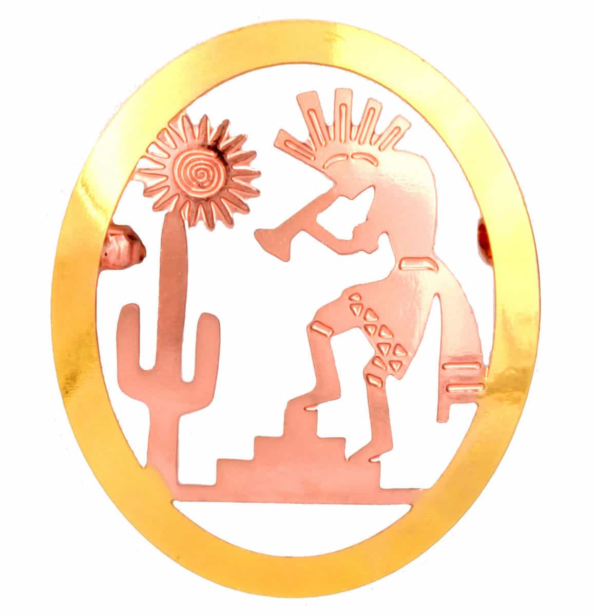 This unique Southwest Native Kokopelli brooch has two tone copper and gold cut through design that is protected with acrylic finish. Kokopelli is symbol of fertility deity, and is still worshiped by many Native American tribes in the Southwest. Kokopelli is also thought to be a trickster, traveling salesman, musician, warrior and hunting magician.