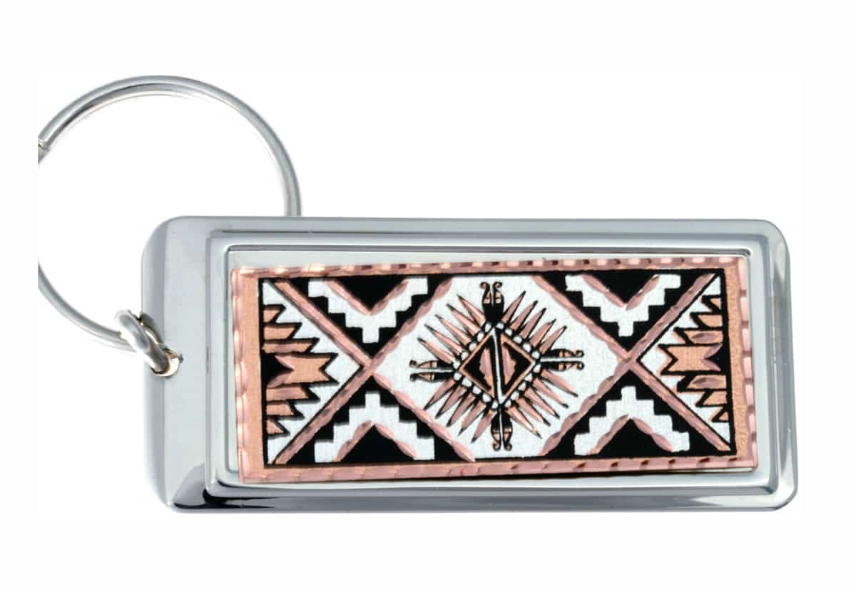 Handmade keychains feature copper artwork that is handcrafted by skilled artisans, silver plated and diamond cut in Southwest Native Sunburst design, then inlaid on metal keyrings. The sunburst symbol is considered as a symbol of growth as the sun gives light and heat that sustains life. The sun rays represent the main directions North, East, West and South.