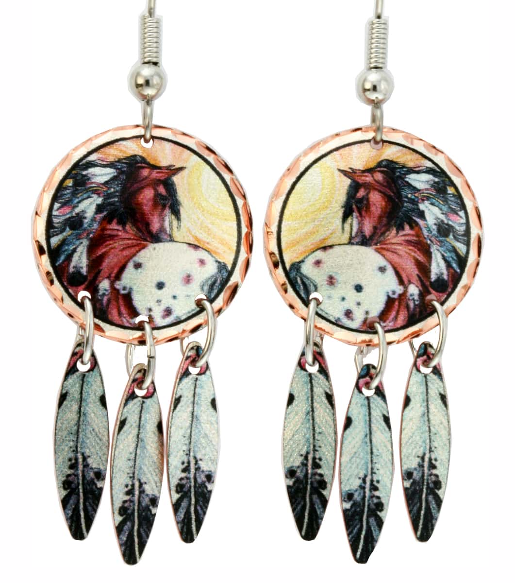 These colorful spotted horse earrings with three copper feather dangles are handcrafted, silver plated and diamond cut on copper. Handmade earrings with spotted horse with feather dresses artwork by Lynn Bean will be a unique gift for horse lovers.