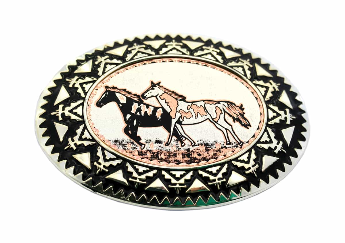 Western belt buckle handcrafted by the artisans of Copper Reflections in American wild spotted horses scene. These western belt buckles have a distinct style that complements many pieces of western clothing, from western shirts to cowboy hats and western bolo ties. Our cowboy belt buckle collection includes horse, rodeo, wildlife and Native designs.