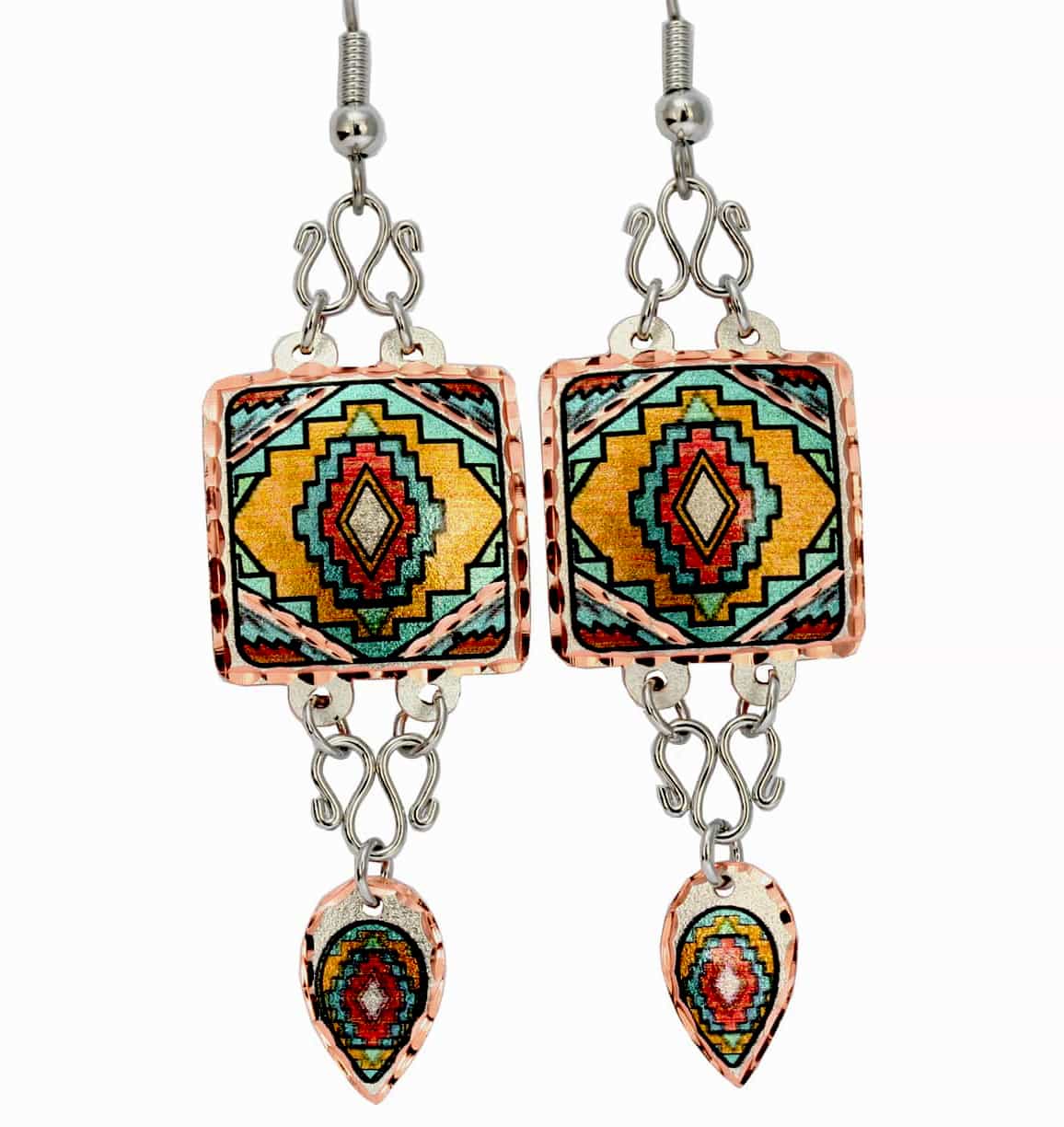 These unique handcrafted earrings are silver plated and diamond cut with wire accents and copper dangle in this colorful Southwest Native cloud weaving inspired design. Clouds symbolize prosperity and fertility.