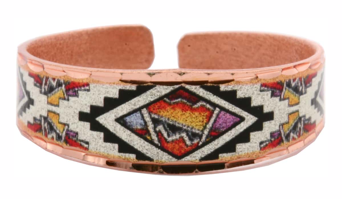 SW Native rings handmade from copper in colorful Southwestern artwork by Lynn Bean. Buy Native American rings creative and artistic soul in mind. Copper Reflections is the only place where you can find these gorgeous art jewelry rings. Colorful adjustable Southwestern copper rings are 0.7 cm (0.27 inches) wide in the middle and 6.2 cm (2.4 inches) long. Fit most fingers sizes 6 to 10. This expensive-looking yet affordable unique ring will put you in the spotlight and be a conversation piece with your friends.