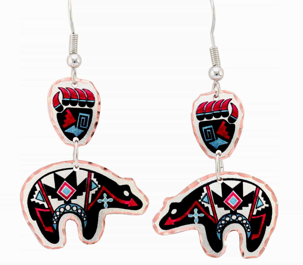 Native bear and bear claw earrings are made from copper in a colorful bear design dangling from a bear claw. Buy dangle bear and bear claw earrings to impress everyone with the beauty of the artwork and the quality of the craftsmanship. The bear symbolizes the most powerful animal believed to be the Guardian of the West and has the power to heal and transform passions into true wisdom.