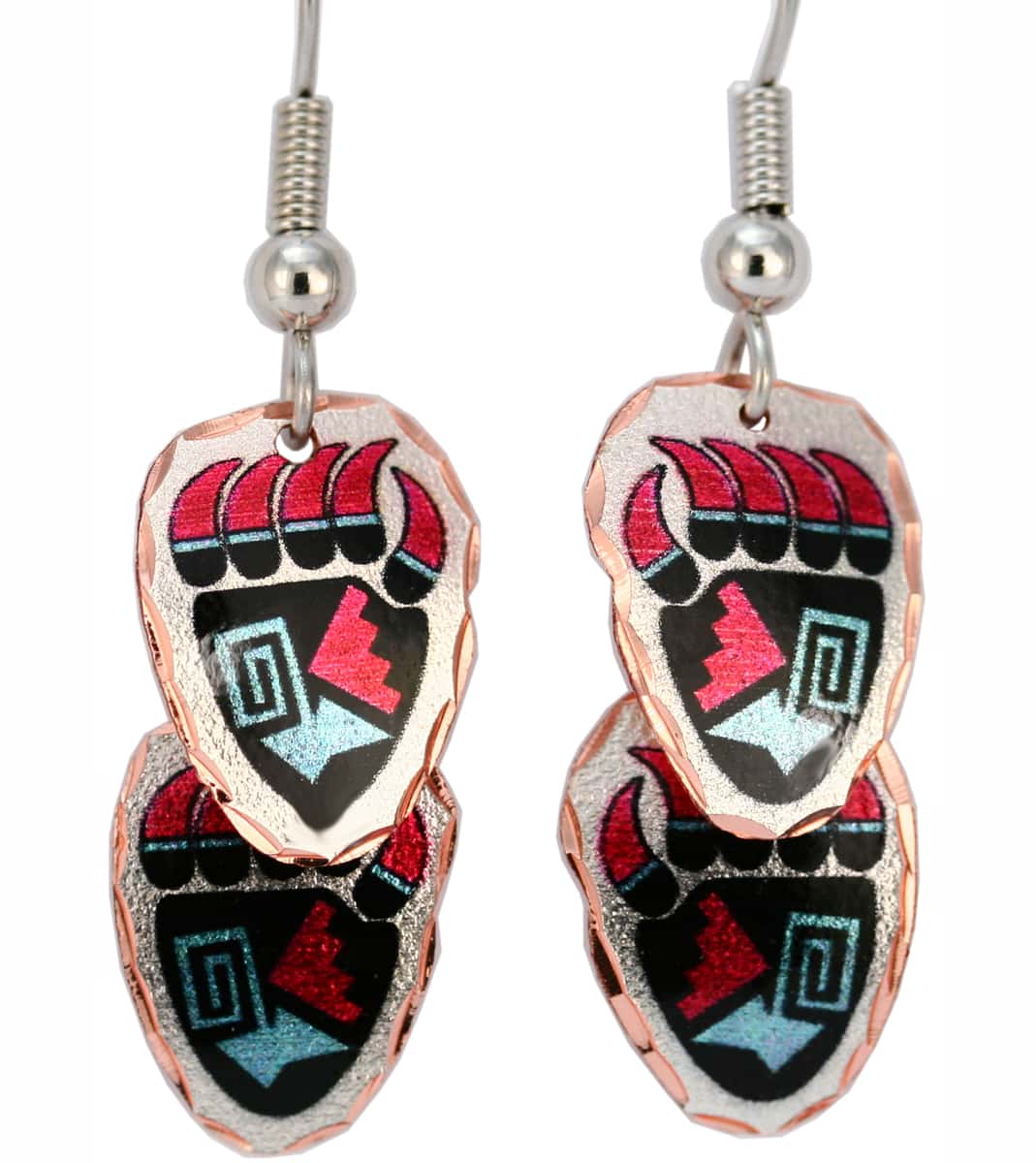 Dangle SW Native bear paw earrings are made from copper in colorful bear paw designs. Buy bear paw earrings for women never go out of fashion and are always a pleasure to wear. Surgical steel hypoallergenic ear wires will make these handmade dangle earrings safe to wear even if you have sensitive skin. Women’s stunning dangle bear paw earrings are the best choice if you are looking for extraordinary and elegant jewelry that no one else has.