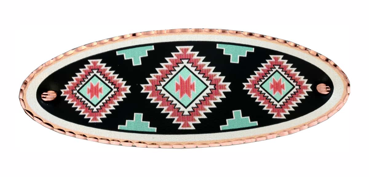 SW Native American hair clip handcrafted from copper, silver-plated in a colorful amazing artwork symbolizing clouds. Shop unique Southwestern Native hair clips that you can not find anywhere else. Hair clips are made in an oval shape 33.5 x 93 mm ( about 1.3 x 3.7 inches) in size. 3 inches long French barrette backings are securely riveted on the back of the copper hair clips. Looking for something exceptionally unique for that hard-to-shop-for girlfriend? This lovely Native-inspired hair clip will be the best choice.