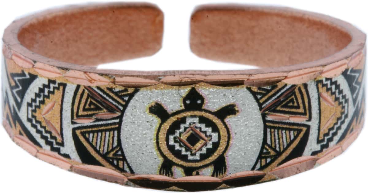 Native turtle rings handmade from copper in Southwestern flair. Buy adjustable wholesale copper jewelry & stylish turtle rings. Skilled artisans provide rich and beautiful Native American inspired designs on copper rings that are silver plated and diamond cut by hand. The native copper ring is 0.7 cm (0.27 inches) wide in the middle and 6.2 cm (2.4 inches) long. Fit most fingers sizes 6 to 10.