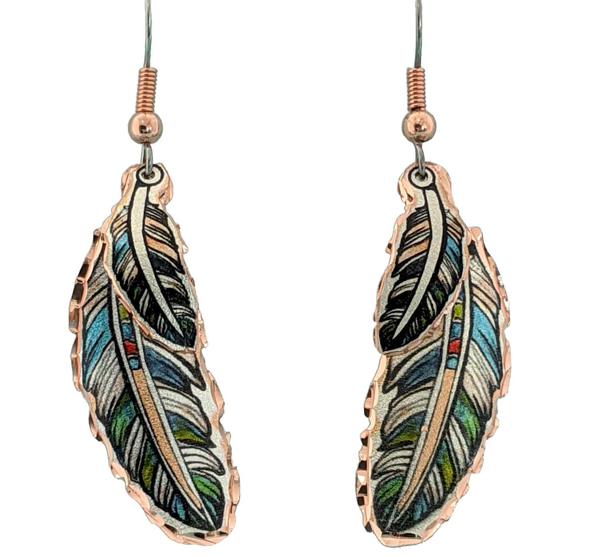 Painted eagle feather design with blues and greens has a Southwest flair that fits perfect with your western style. Small and large feather artwork is overlapped to create these stylish handmade earrings.