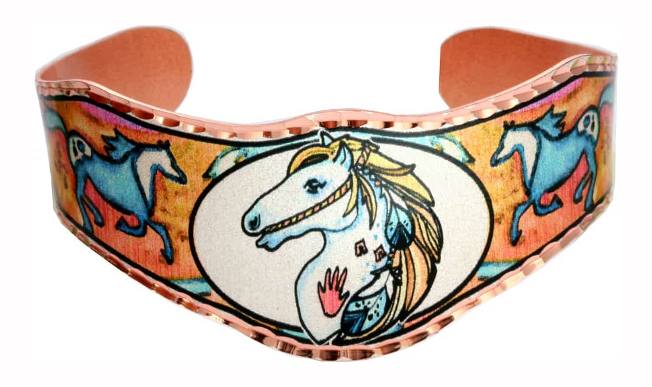 Copper handmade bracelets are individually silver plated and diamond cut on copper in this colorful Indian war horse bracelet design from Lynn Bean. A hand painted on the war horse was one of the highest marks of honor for a horse, earned by safely returning its rider from battle. Other symbols such as stripes, arrowheads and circles would ask the spirits to aid the natural ability of the horse protecting both horse and rider.
