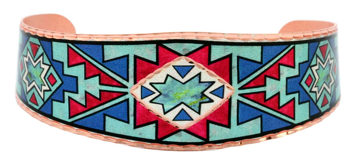 Colorful Southwest Native Star inspired design is featured in vibrant colors to create these stunning handmade copper bracelets. The Hope symbol is represented by the eight pointed star that symbolizes hope and guidance through times of trouble.