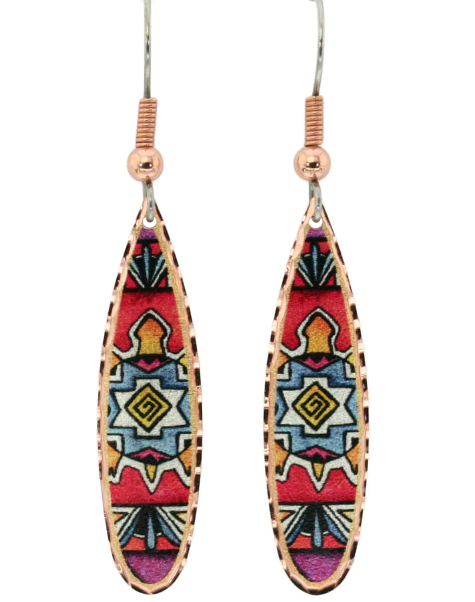 Teardrop colorful Native turtle earrings made from copper in eye-catching shades of red, blue, and silver colors. Buy feminine and unique turtle earrings that you would not find elsewhere. These distinctive and adorable slim teardrop shape copper earrings are 9.4 mm x 35 mm ( about 0.4 x 1.4 inches ) in size. Earrings are lightweight unlike heavy cast earrings so you can wear them the whole day without hurting your ears. Looking at our prices you might be surprised to learn that we use only high-quality components such as pure copper and the best quality surgical steel hypoallergenic ear wires.