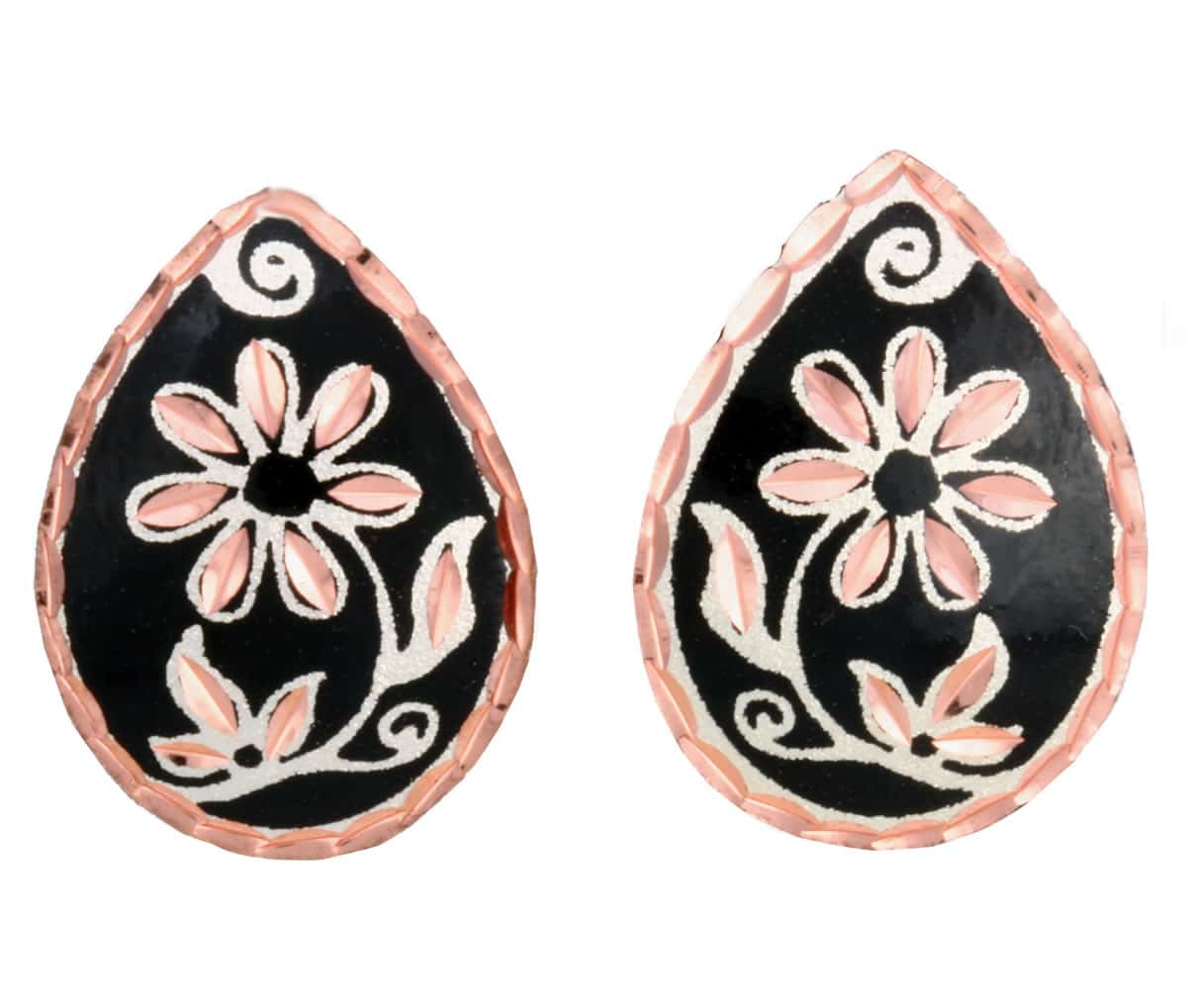 Teardrop flower stud earrings are handmade by skilled artisans from copper in a black background diamond cut to sparkle. Buy flower stud earrings that are so beautiful and you will not find them anywhere else. But it’s not just about the looks! We understand the importance of comfort, which is why these dainty earrings are lightweight and feature hypoallergenic surgical steel stud backings. Say goodbye to skin irritations – our earrings are safe to wear even for those with sensitive skin. At Copper Reflections, we believe that elegance shouldn’t break the bank. That’s why we offer affordable handmade jewelry that exudes an expensive look and quality craftsmanship. You won’t find these unique pieces anywhere else!