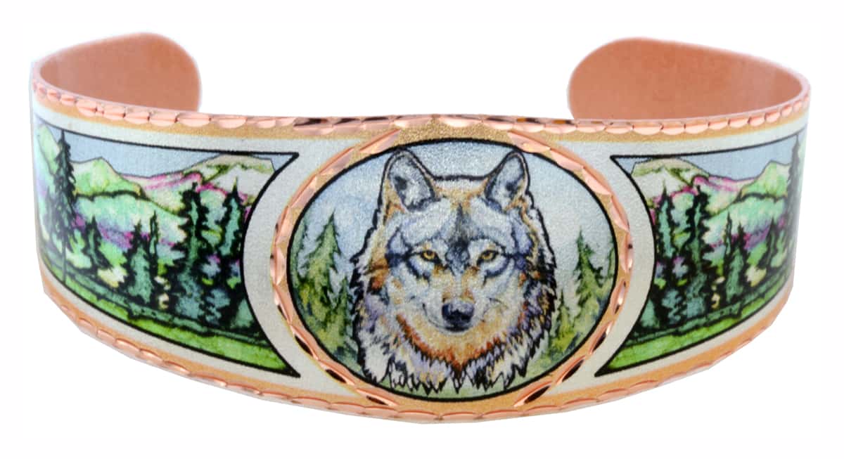 Timber wolf bracelets are a perfect choice if you love the wildlife and wolves. Handcrafted from copper in watercolor artwork by Lynn Bean. Buy this wolf bracelet that will take your breath away with the high-quality craftsmanship and the originality of the artwork.