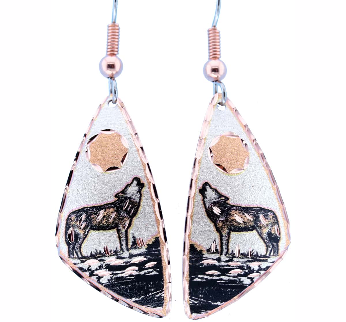 Howling wolf earrings handmade from copper with silver plating and diamond cutting. Wear these wolf earrings to show your love for wildlife. Creative techniques and distinctive designs make these beautiful colorful wildlife animal earrings truly unique to Copper Reflections.