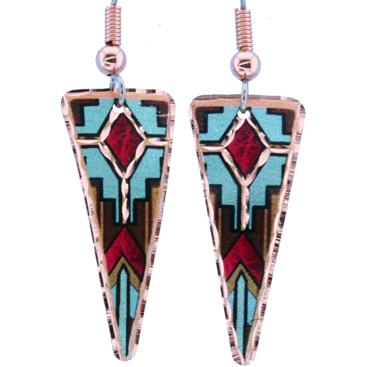 Turquoise color Native earrings handcrafted in stunning Southwestern art with vibrant colors. Buy unique wholesale native earrings for your gift store. Copper Reflections is the best online wholesale Native jewelry shop. Buy turquoise & burgundy color Native art earrings that cannot find elsewhere. These magnificent triangle shape Native earrings are 12 mm X 28 mm ( about 0.48 x 1.1 inches ) in size.