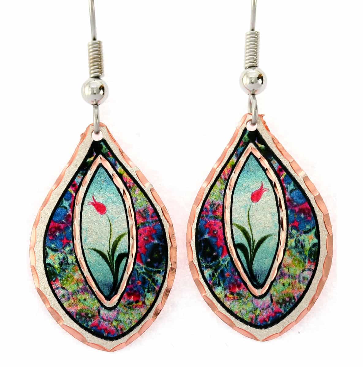 Tulip earrings are handmade from copper in colorful pretty tulip artwork and sparkling diamond cuts for a luxurious look. Buy chic handmade tulip earrings will take your breath away every time you wear them. Introducing tulip earrings, a masterpiece of craftsmanship and elegance. These unique handmade earrings by Copper Reflections are a fusion of artistry, spirituality, and individuality, making them an extraordinary addition to your jewelry collection. Crafted from copper and adorned with colorful tulip artwork, these earrings are truly mesmerizing. The diamond cuts on the surface create a sparkling effect that catches the light from every angle, giving them a luxurious look that will surely impress everyone you meet.