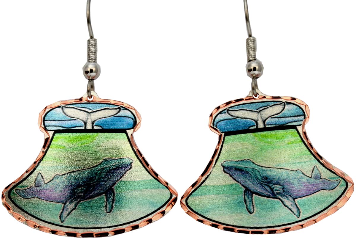 Unique Alaska earrings are handcrafted from copper in colorful humpback whale artwork. Buy amazingly stylish Alaska earrings high quality yet affordable. We use only the best quality surgical steel hypoallergenic ear wires so you can safely wear them. All our jewelry is nickel free. The Whale embodies the essence of nature, life force, and fertility, in particular the fertility of the waters.
