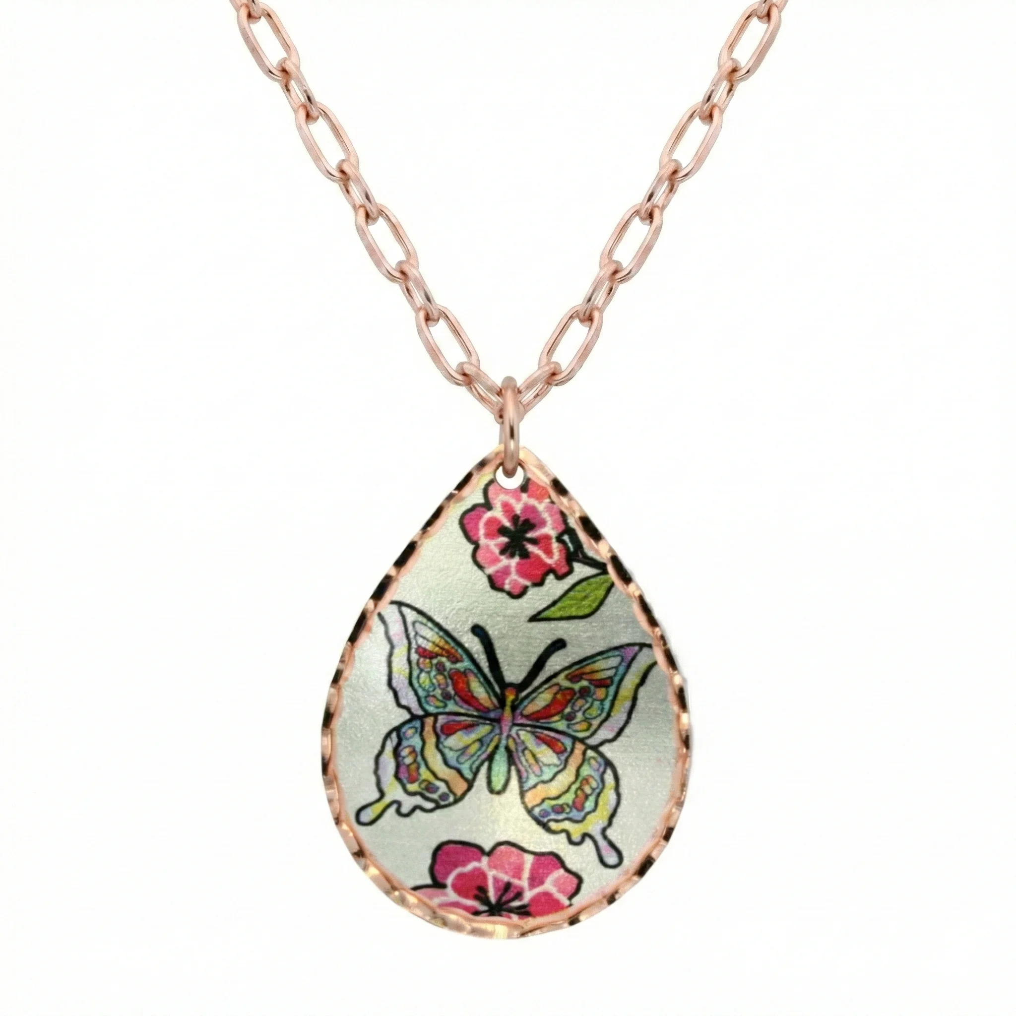 Embrace the enchanting beauty of nature with our Unique Copper Butterfly Necklace, a stunning piece of wearable art. Handmade from copper and silver-plated for a radiant finish, this necklace features intricate butterfly artwork enhanced with sparkling diamond cuts that shimmer with every movement. Protected by multiple layers of acrylic, it requires no polishing and will remain brilliant for years. Suspended from a 20-inch copper-tone chain, this necklace is the perfect accessory to elevate any outfit—from casual daytime looks to elegant evening wear. Affordable, unique, and artisan-crafted, it’s a timeless treasure you won’t find anywhere else.