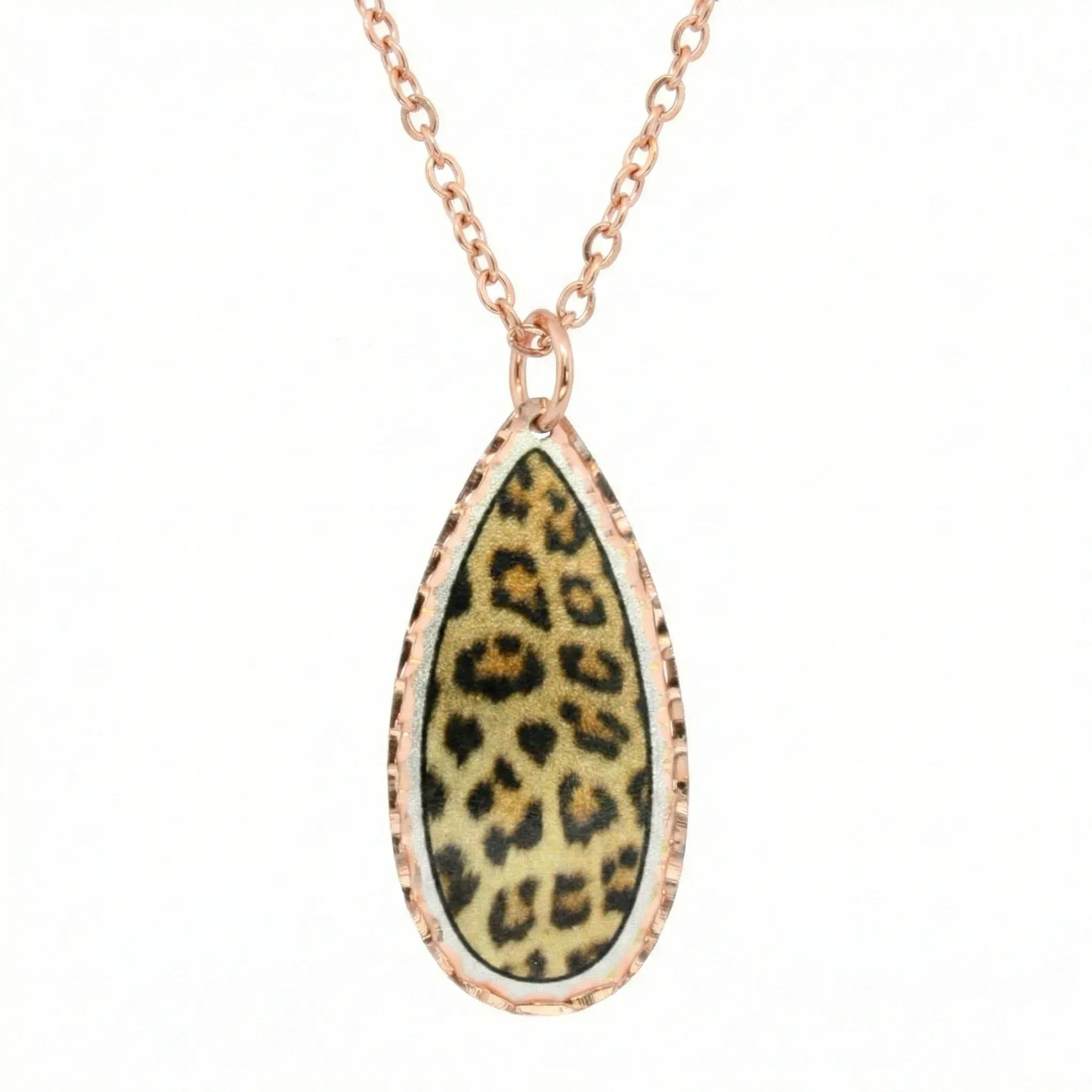 Unleash your wild side with our Unique Copper Leopard Print Necklace. Artisan-crafted from copper and silver-plated, this trendy pendant features vibrant translucent colors in a classic leopard pattern. Diamond-cut to sparkle and finished with a protective acrylic coating, it comes with a 20-inch copper-tone chain. Affordable luxury that never requires polishing!