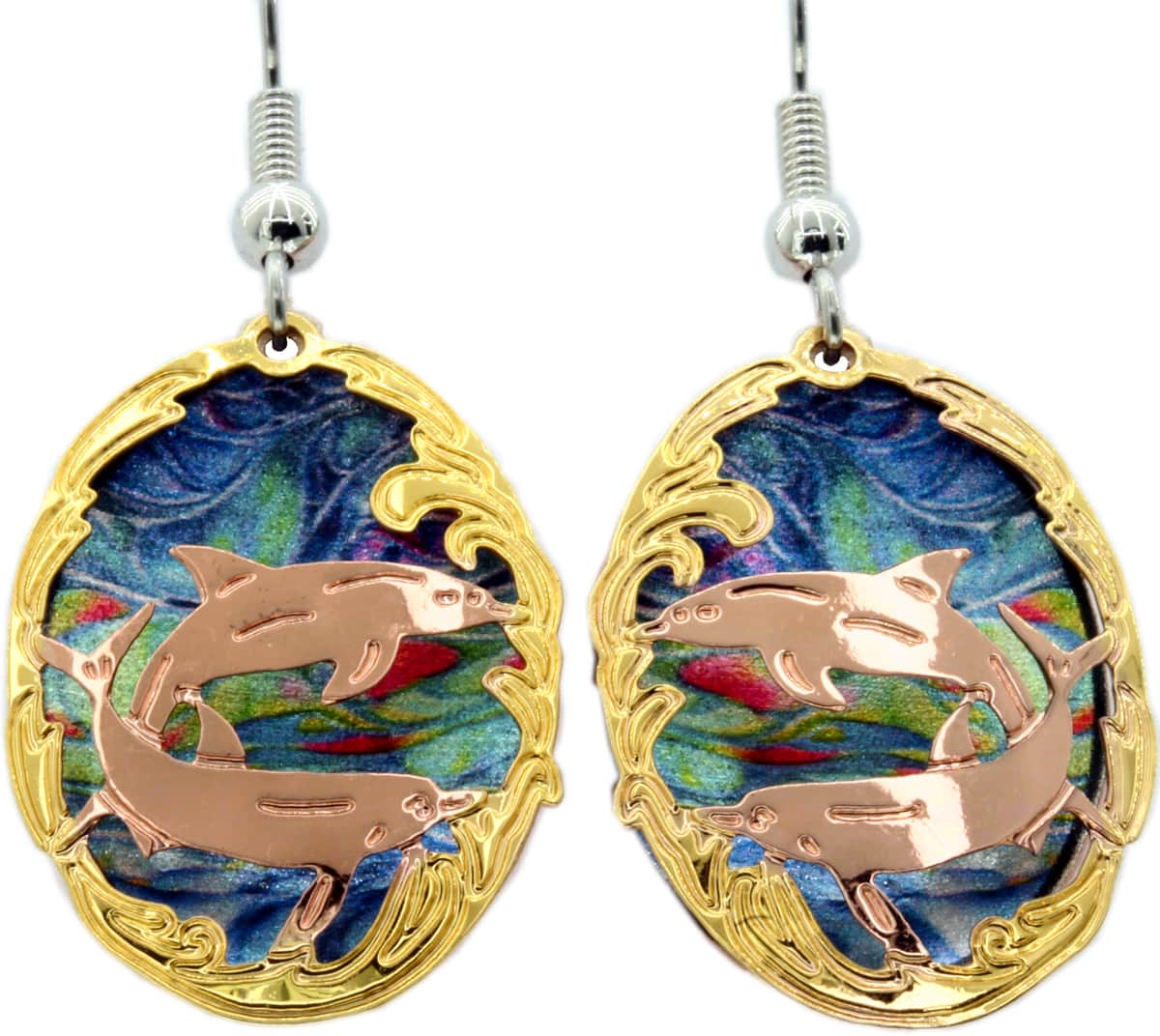 Artistic and colorful cut out dolphins earrings created in two-tone copper and a pretty gold-filled border with dangling colorful copper artwork for a 3D look. The quality of the ear wires is very important not to have allergies or ear infections. We only use surgical steel hypoallergenic ear wires on our dolphin earrings for women as they are the safest ear wires, especially for women who have sensitive skin.