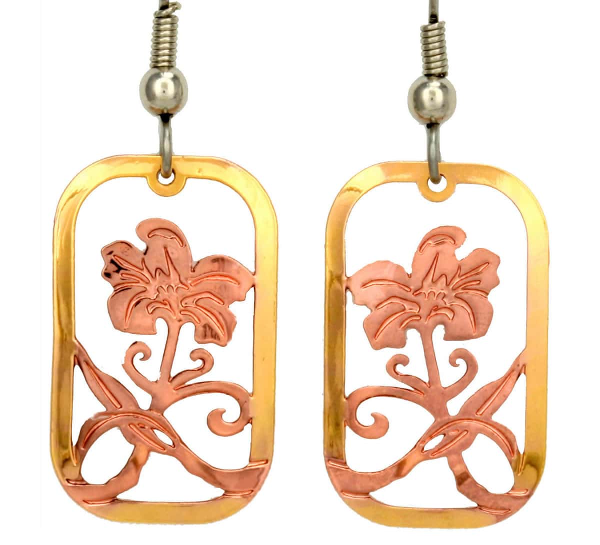 Cut out flower earrings are two-tone plated in gold and copper in flower design. The lily carries the meaning of hope and renewal. The life cycle of the lily symbolizes resurrection stories found in many cultures. It blooms in the spring, flowers and dies, then mysteriously blooms again without aid.