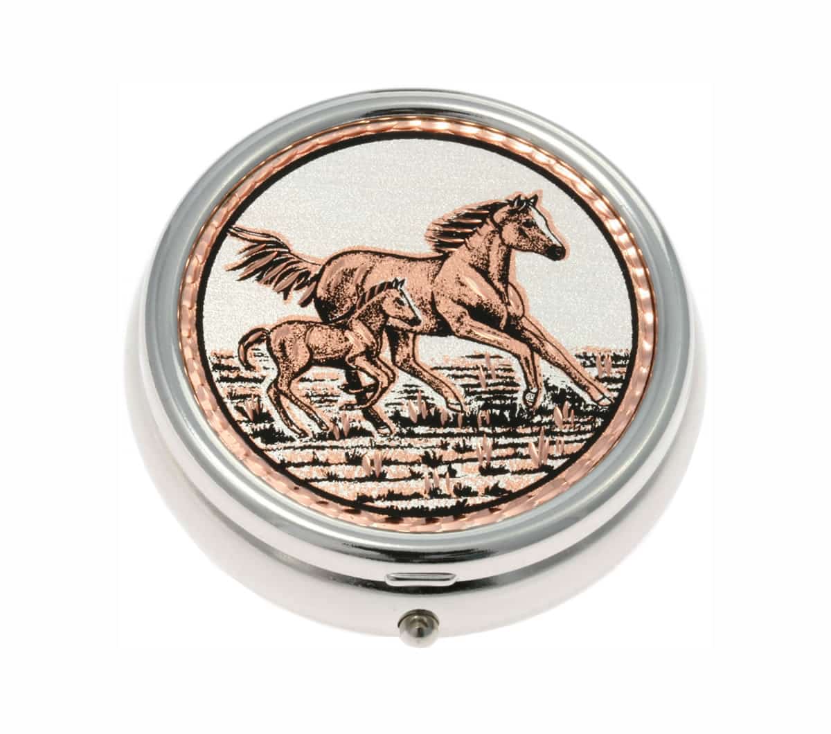 Pill box artwork is handmade, silver plated and diamond cut by the skilled artisans of Copper Reflections horse and foal design. These horse pill boxes will make perfect unique gifts for horse lovers.
