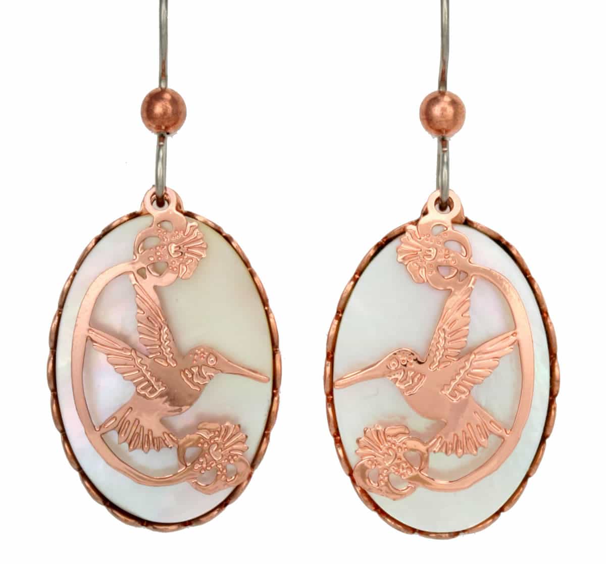 Mother of pearl hummingbird earrings is created from an etched-out copper hummingbird and flowers design that dangles in front over the mother-of-pearl shell that is inlaid into a pretty copper bezel.