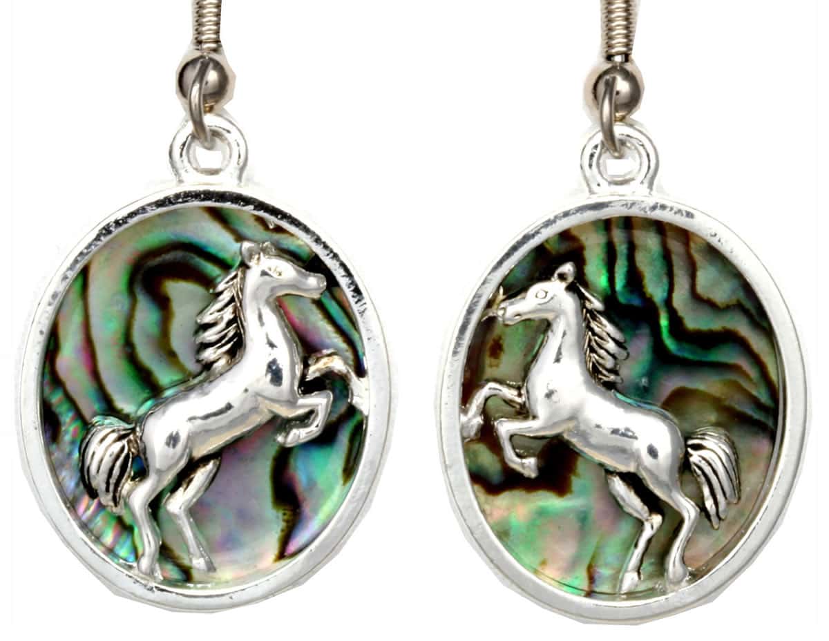 Abalone shell silver-plated horse earrings are created in this pretty cut-out rearing horse cast design adorned with a shell. Shop beautifully unique abalone horse earrings that are original and affordable. These amazing fashion earrings are lightweight, and ear wires are the best quality surgical steel hypoallergenic so you can comfortably and safely wear them for a long time even if you have sensitive skin.