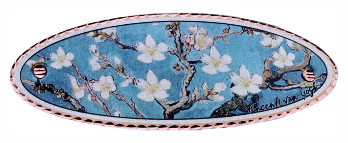 Van Gogh Almond blossom hair clip handcrafted in amazing and famous almond blossom painting. Buy an incredibly marvelous almond blossom hair clip. Almond tree blossom branches like this against a blue sky were one of Van Gogh’s favorite subjects. Almond trees flower early in the spring making them a symbol of new life. Hair clips are made in an oval shape of 3.7 inches x 1.3 inches (93 mm x 33.5 mm) in size.