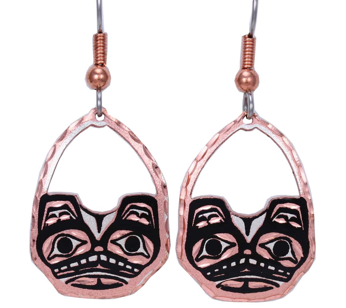 Introducing the West Coast Haida bear earrings by Copper Reflections – the perfect addition to your jewelry collection! These unique and stylish earrings are handmade with the finest craftsmanship and cut with precision using a state-of-the-art CNC machine. Made from copper, these earrings are not only durable and scratch-resistant, but they also do not change color over time. The ear wires are hypoallergenic surgical steel, ensuring a comfortable and safe wearing experience for even the most sensitive ears. Make a statement and reflect your individuality with this truly special jewelry that you won’t find anywhere else. The sparkling diamond cuts add a touch of luxury to these charming and elegant earrings.