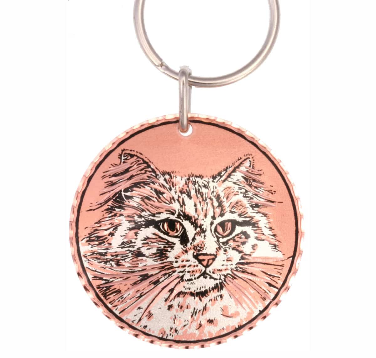 The cat keychain is handmade from silver-plated copper in a pretty Persian cat design with diamond cuts to sparkle. Buy cat key chains for a cat-lover friend. The exquisite, one-of-a-kind Persian Cat Keychain, is a true masterpiece crafted by Copper Reflections. Handmade with love and attention to detail, this keychain is a perfect blend of elegance and durability.
